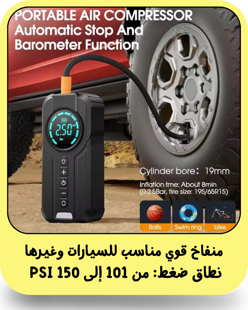 بينفخ كاوتش عربيتك فأقل من 5 دقائق ومزود بعداد ديجتال يقيس ضغط كاوتش وبيفصل اتوماتيكي عند الضغط اللي تضبطه عليه ✅ ومعاه طقم اكسسوار العجلة والعوامة والمراتب